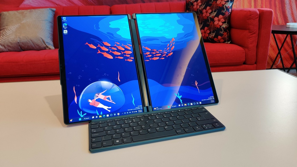 Yoga Book 9i là mẫu laptop đầu tiên của Lenovo trang bị 2 màn hình OLED. Không chỉ hỗ trợ gập, thiết kế của Yoga Book 9i cho phép người dùng chủ động bố trí 2 màn hình theo dạng xếp chồng hoặc đặt cạnh nhau như cuốn sách.