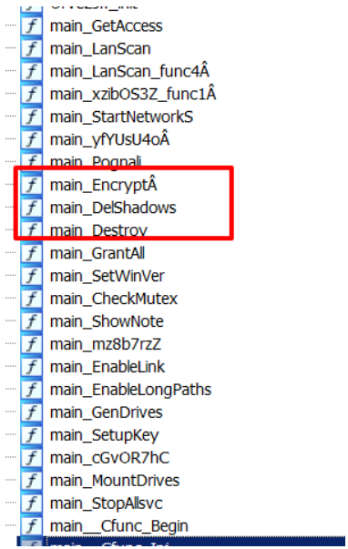 Sử dụng một script IDA Python để đổi tên (rename) các hàm trong Go, chúng ta có thể quan sát được các hàm đặc trưng thường thấy trong ransomware, cụ thể như main_DelShadows và main_Encrypt.
