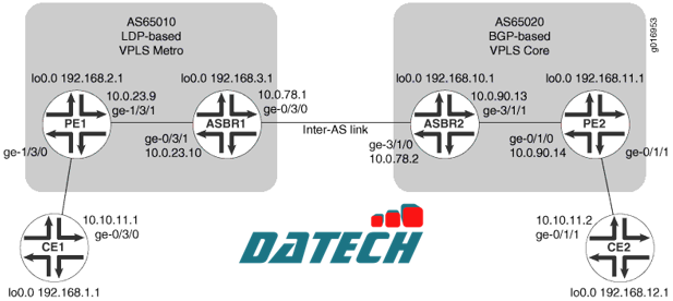 Ví dụ này mô tả cách cấu hình dịch vụ LAN riêng ảo (VPLS – Virtual Private LAN Service) giữa các hệ thống tự trị (Inter-AS), với chức năng xử lý địa chỉ MAC tại ASBR, giữa VPLS sử dụng tín hiệu BGP và VPLS sử dụng tín hiệu LDP. Tính năng này được mô tả trong RFC 4761 với tên gọi là multi-AS VPLS option E hoặc method E.
