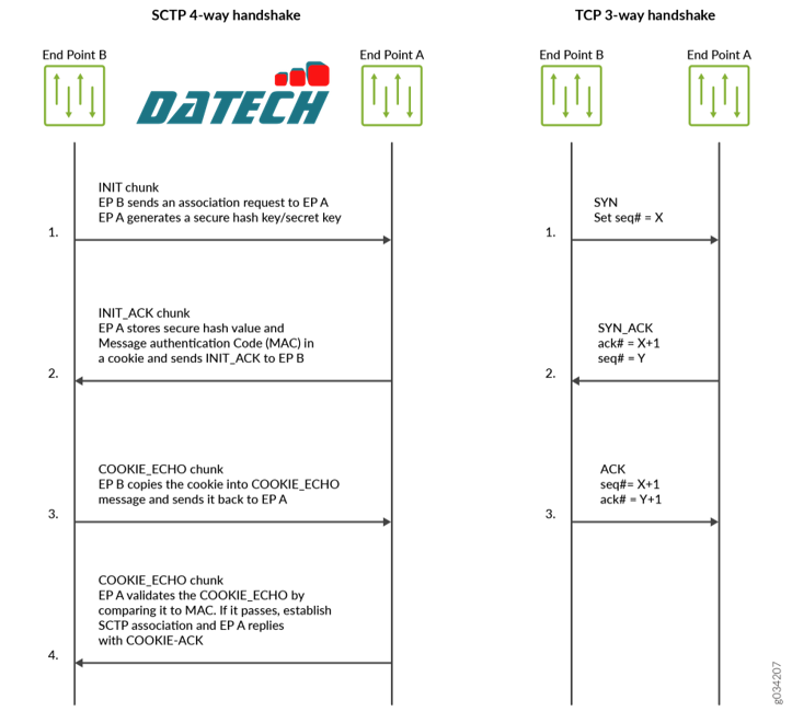 Hình 1: Bắt tay 4 bước của SCTP so với bắt tay 3 bước của TCP