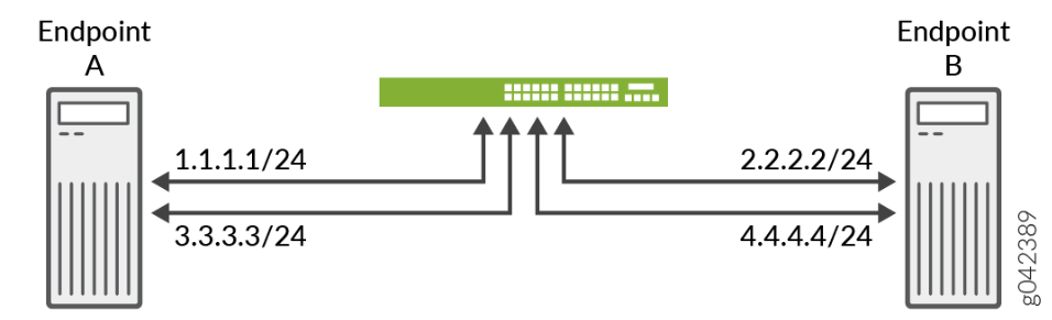 Trong Hình 3, điểm cuối A được kết nối với thiết bị tường lửa SRX Series với hai địa chỉ IPv4, và điểm cuối B cũng được kết nối với tường lửa SRX Series với hai địa chỉ IPv4.
