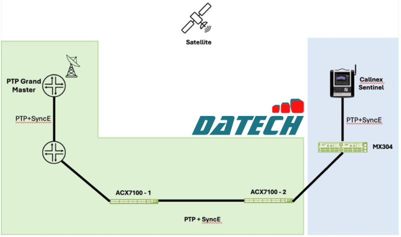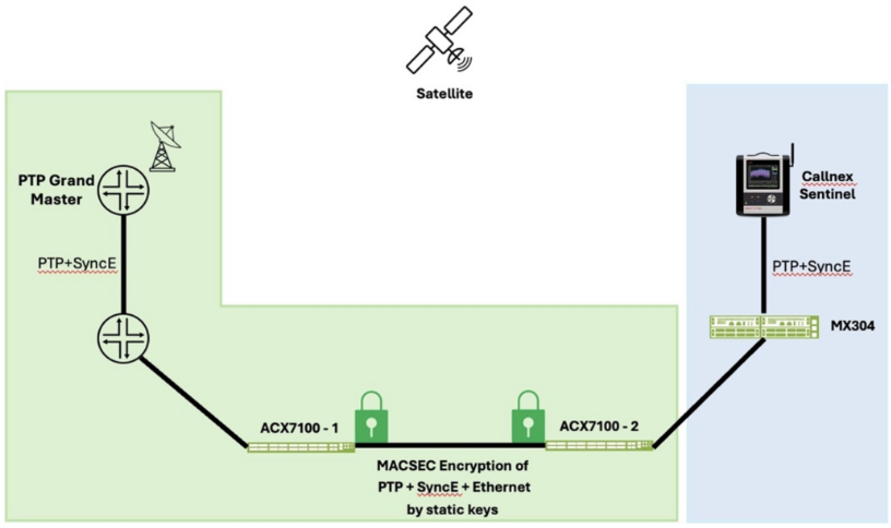 Đường đồng bộ và đường truyền dữ liệu (Synchronization and Data Path): Turkcell đã xác thực rằng các thiết bị Juniper ACX7100 được triển khai thực tế (field-deployed) có khả năng bảo mật cả lưu lượng dữ liệu và lưu lượng đồng bộ thời gian theo cách chống chịu được các cuộc tấn công từ máy tính lượng tử (quantum-resistant). Trong mô hình kiểm thử này, Turkcell sử dụng nguồn đồng bộ đang hoạt động thực tế (in-service synchronization source) để truyền thông tin thời gian giữa một cặp thiết bị Juniper ACX7100 (vùng màu xanh lá cây – green area). Lưu lượng này được truyền qua thiết bị định tuyến Juniper Networks™ MX304 Universal Router, sau đó được đưa vào thiết bị đo lường đồng bộ Calnex Sentinel Synchronization Measurement đặt trong phòng thí nghiệm Turkcell (vùng màu xanh dương – blue area).