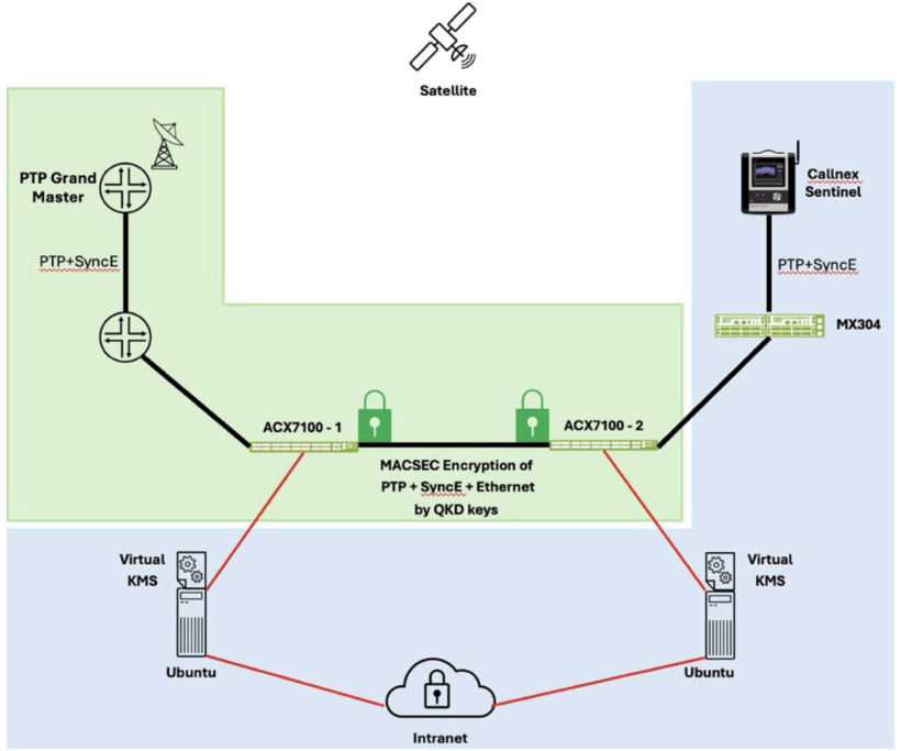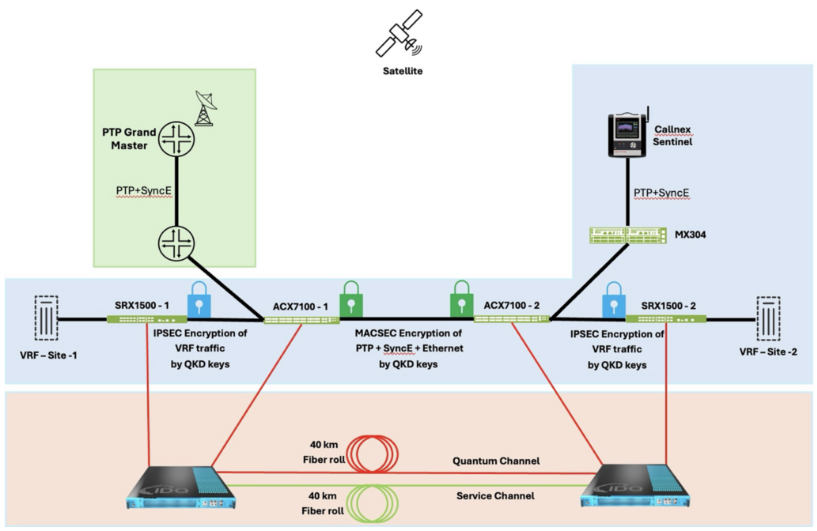 Giải pháp này sử dụng Media Access Control Security (MACsec) để bảo mật toàn bộ lưu lượng truyền trên đường dây, bao gồm dữ liệu người dùng (Data), PTP, và SyncE. Ngoài ra, quá trình kiểm thử còn tận dụng các khóa được tạo bởi hệ thống QKD (Quantum Key Distribution) của IDQ để vận hành MACsec ở chế độ an toàn lượng tử (quantum-safe mode).