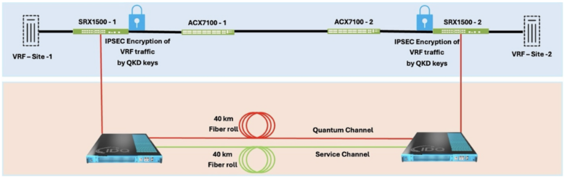 Mô hình thử nghiệm đã xác nhận rằng thiết bị tường lửa Juniper Networks™ SRX1500 có thể cung cấp dịch vụ IPsec an toàn lượng tử (quantum-safe IPsec) tương thích hoàn toàn với thiết bị QKD của ID Quantique (IDQ).